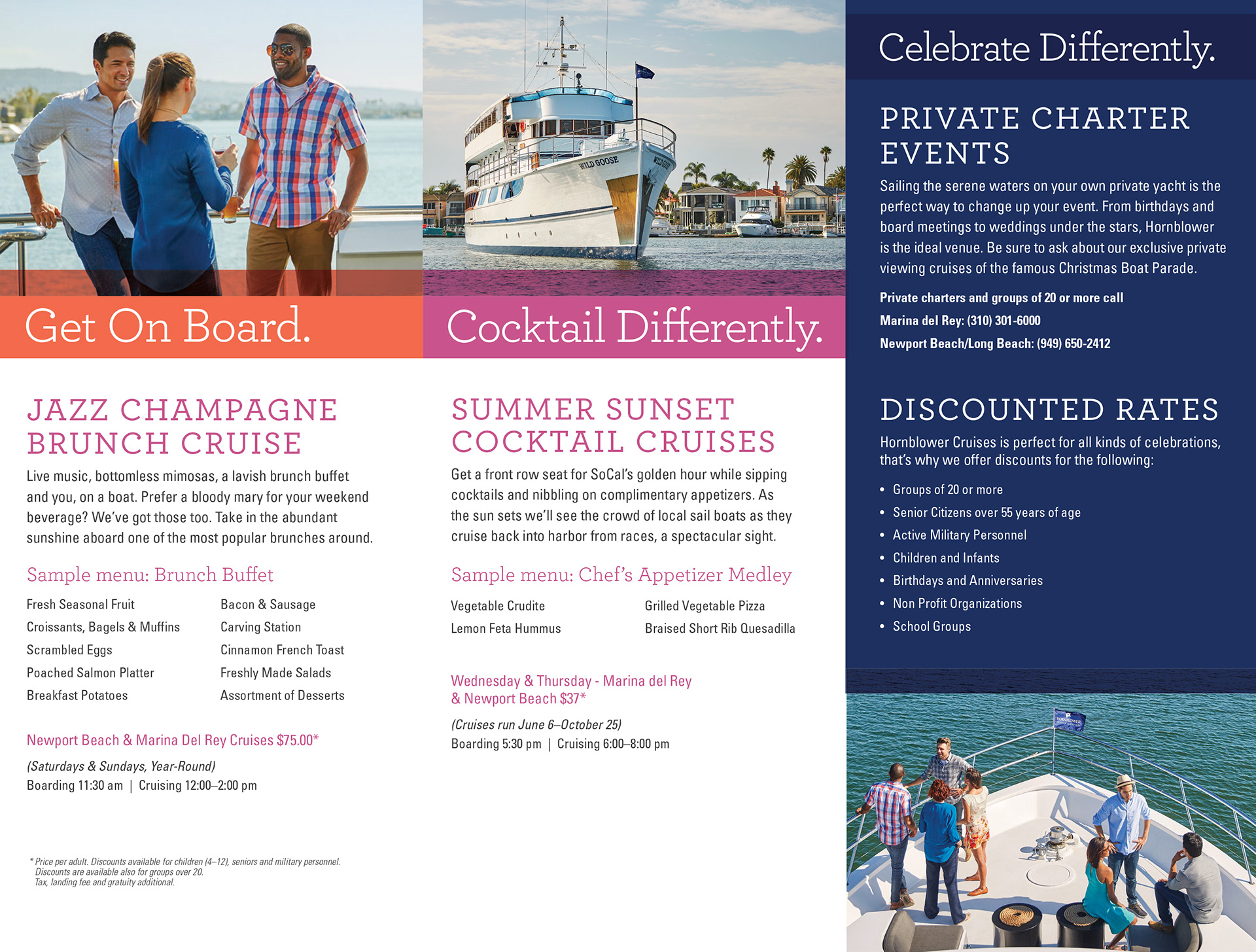 Print Materials: Contemporary, on-brand collateral that entices customers, reinforces the dining cruise experience, and supports promotional strategies.